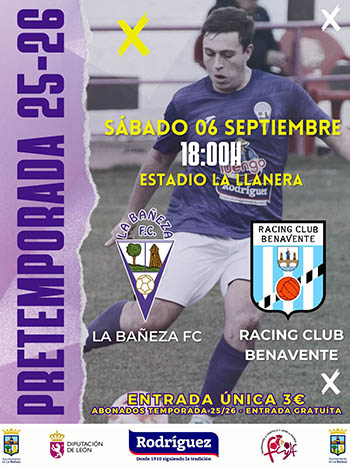 Este próximo sábado 6 de septiembre, La Bañeza F.C. disputará su último partido amistoso después de una intensa pretemporada. En este caso lo hará frente al Racing Benavente, que milita en la 1ª Provincial de Zamora, siendo una buena piedra de toque pues es un equipo que casi siempre se mantiene en los puestos altos de la clasificación.