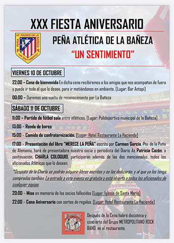 En la primera jornada, los participantes disfrutarán de una cena de bienvenida. Ya el sábado, los festejos arrancarán a las 11:00 horas con un partido de fútbol sala entre atléticos en el Polideportivo Municipal. Seguidamente, habrá ronda de bares y una comida de confraternización, que precederá a la presentación del libro ‘Merece la pena’, de Carmen García. A las 20:00 horas, en la iglesia de Santa María tendrá lugar una Misa en memoria de los socios fallecidos de la peña y, a las 22:00 horas, la gran cena de aniversario en el Restaurante La Hacienda con discoteca y la actuación del grupo Metropolitano Rock Band.