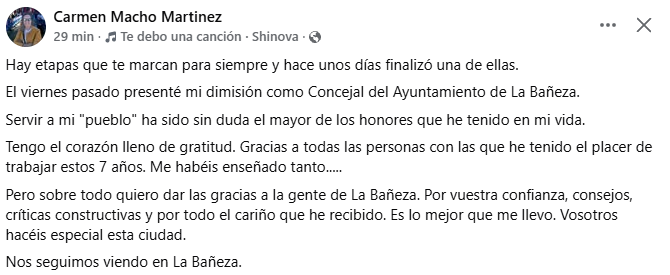 Macho concluyó su mensaje asegurando que se lleva consigo el afecto de los bañezanos y subrayando que seguirá vinculada a la ciudad: “Nos seguimos viendo en La Bañeza”.